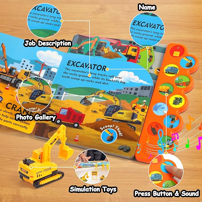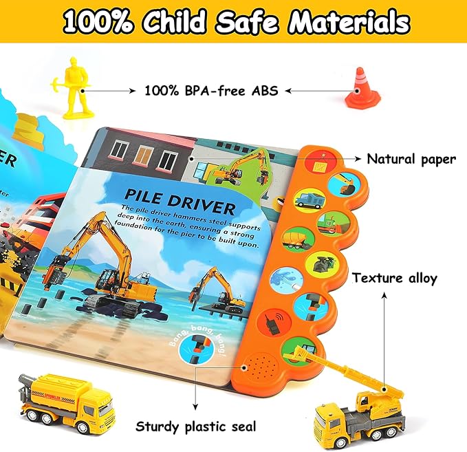 • Durable Materials: Kids board books are made of high quality paper, smooth surface and edges to ensure the safety of children’s use, enough thickness and ABS cover make the book more thick and not easy to damage, suitable for long-term use. Toy construction trucks made of alloy, safe and non-toxic, not easy to break, more texture. Suitable size and weight for carrying or storing on the go.Includes an on/off switch on the back cover to extend battery life