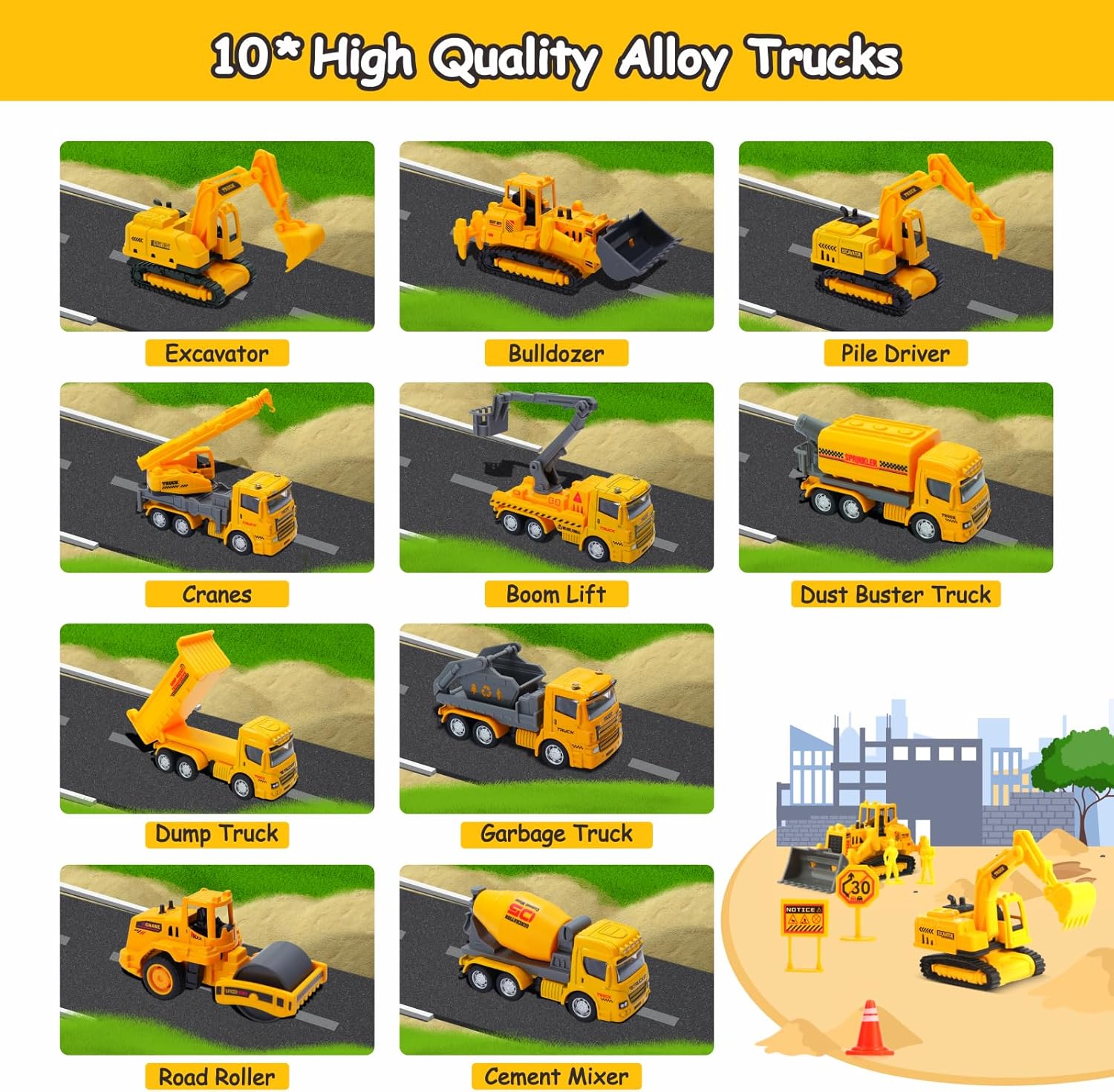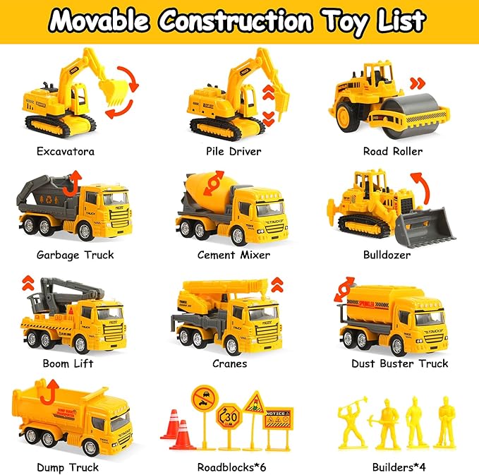 • Value Pack:Toy cars includes a forklift truck, pile driver, crane, aerial work truck, dust collector, lorry, rubbish truck, cement mixer, excavator toy, road roller, and 10 construction accessories, each with movable joints to push and go. Boys construction toys multiple parts and interactive elements allow little construction lovers to have fun with the visual, auditory, tactile and other senses