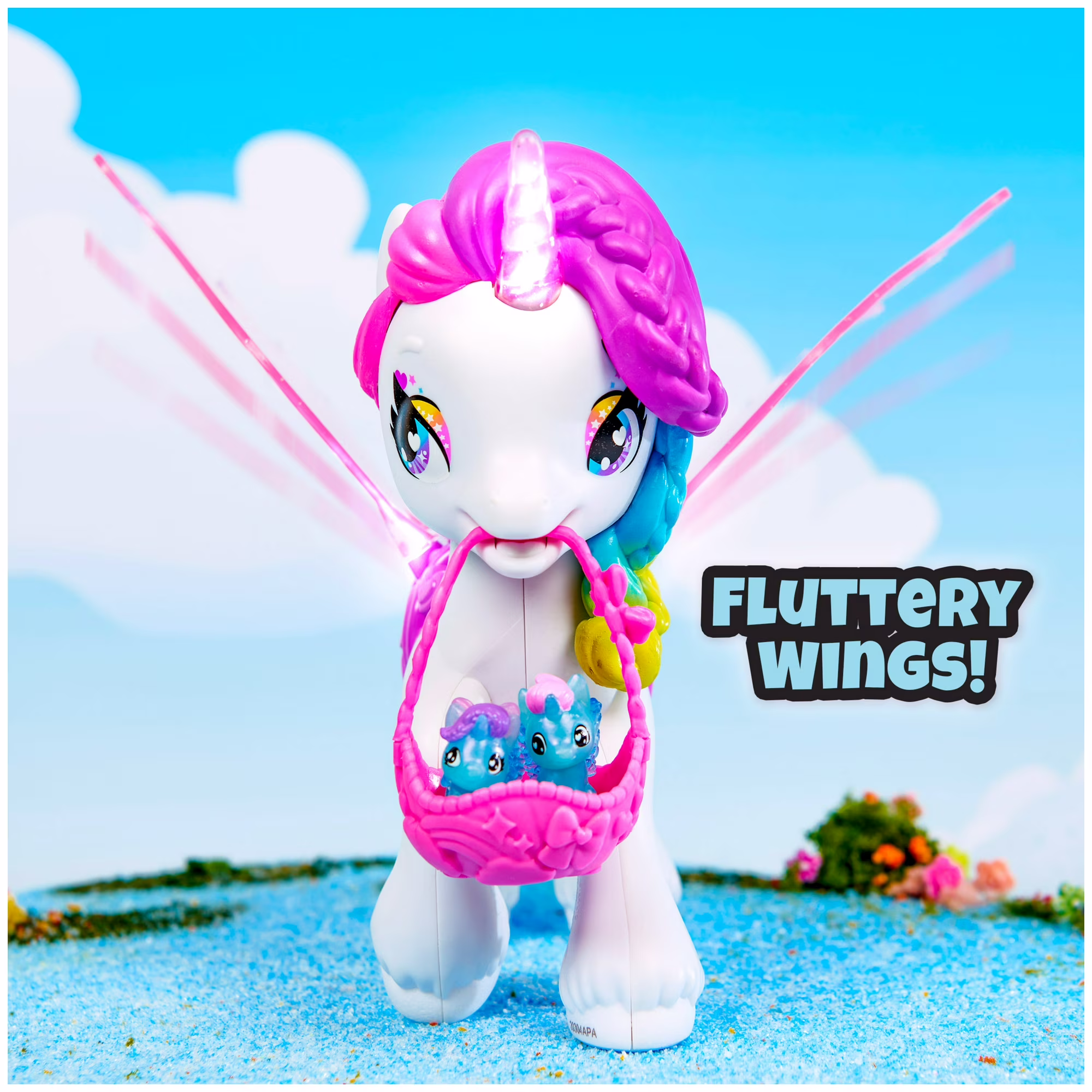 • INTERACTIVE TOY UNICORN: Hatchicorn has over 60 lights and sounds, flapping glittery wings, a rainbow tail you can brush with her comb, 2 exclusive Twin Babies and a basket they can ride in!