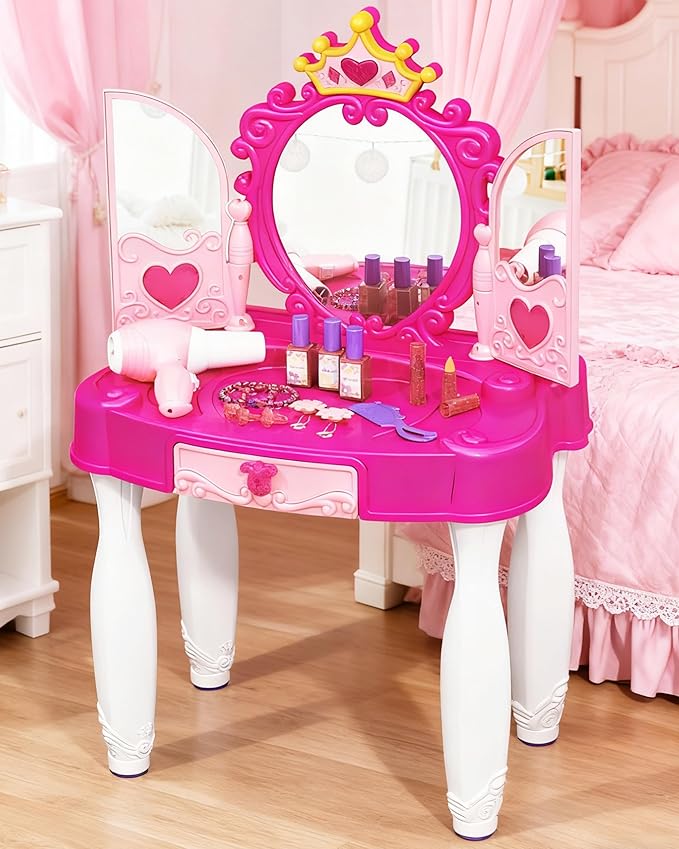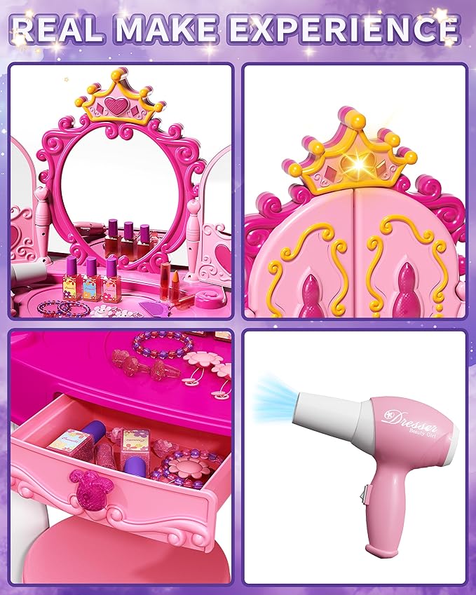 - 【Lights and Music】When the mirror is on, immerse your child in the princess kids dresser with heart-shaped lights and magical music effects. Girls can also use a safe and really effective blow dryer to do hair for their pals and dolls.