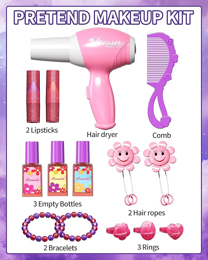 - 【Kids’ Dress Up & Pretend Play Girls Vanity Set】Toddler girls makeup table with chair. Beauty makeup kit include: 3 rings, 3 bottles, 2 hair ropes, 2 pearl bracelets, lipstick and lip gloss, 1 comb and 1 real working hair dryer. Total need 4*1.5V AA batteries (not included)