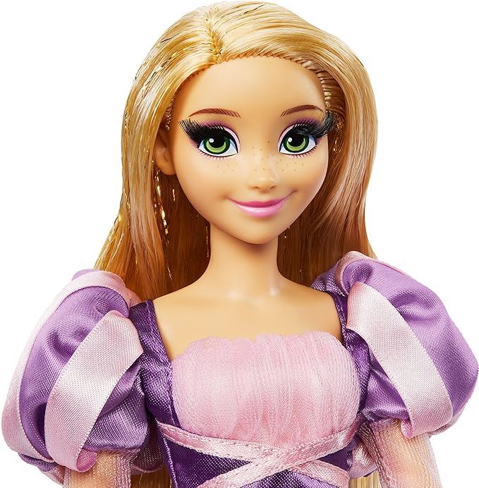 - Recalling her hair’s magical healing powers, Rapunzel doll’s long locks are accented with gold shimmer shine.