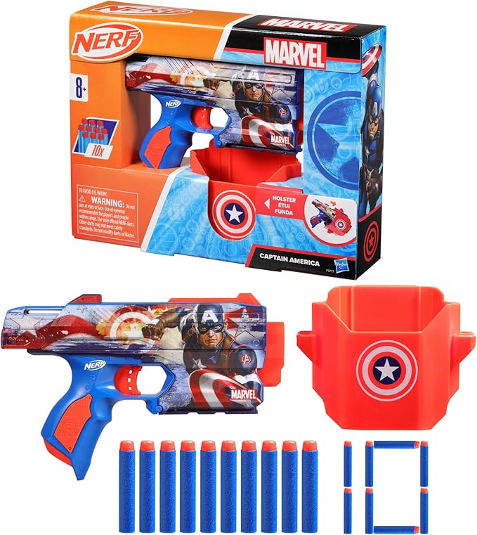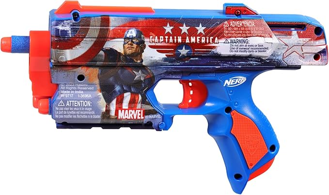 - NERF MARVEL CAPTAIN AMERICA BLASTER: Head into heroic adventures with this eye-catching blaster that features Captain America designs on both sides