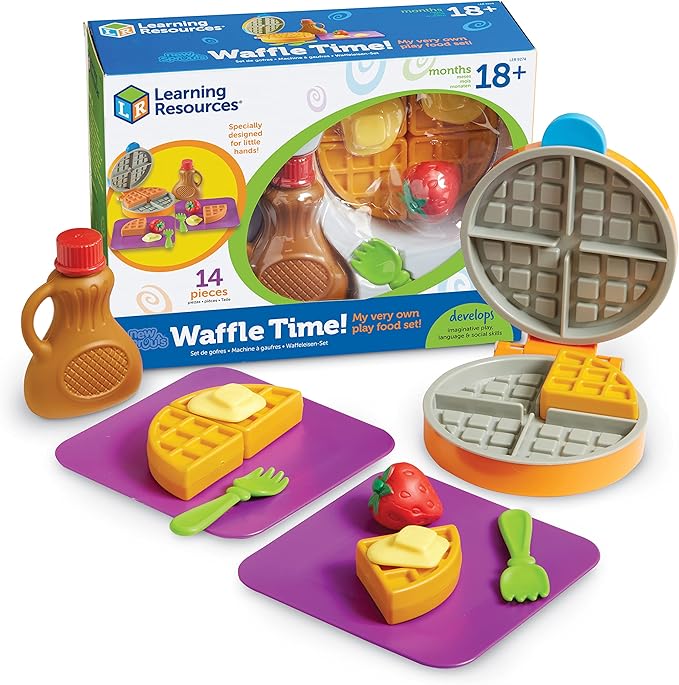 - IMAGINATIVE PLAY – Complete 14-piece breakfast set with realistic waffle iron, syrup bottle, 4-piece waffle, strawberries, butter slices, plates & forks for ages 18 months+