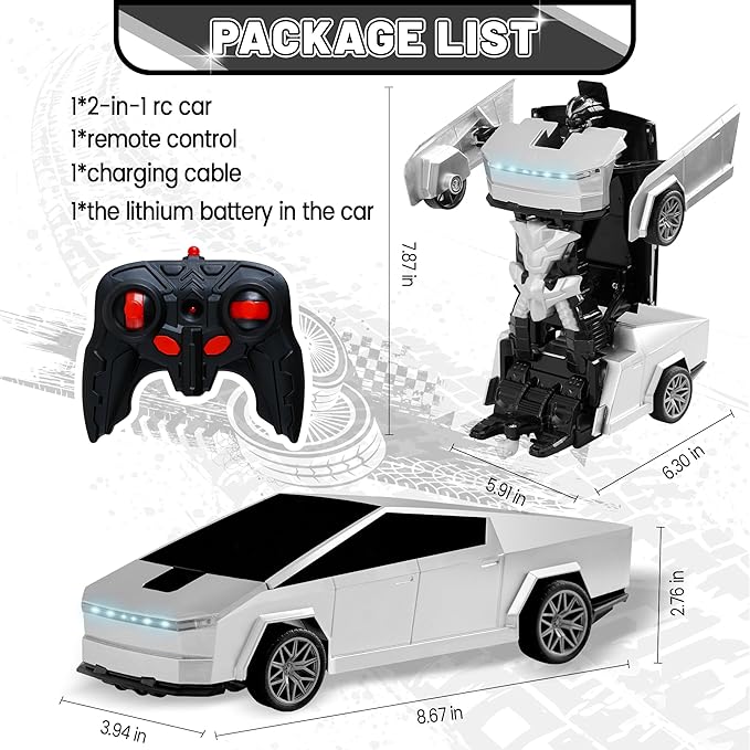- 2-in-1 Robot Toys + Cyber Rc Car Toy: This remote control car toy transform automatically between a toy trucks and a robot toy, giving kids two exciting play modes in one. Not only can the pickup truck toy move, rotate 360° and drift, the robot toy can also move and rotate