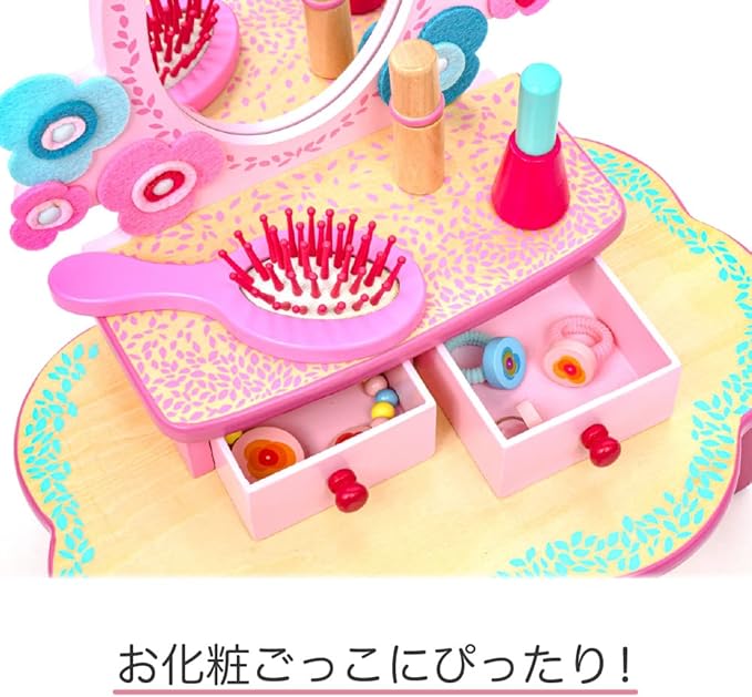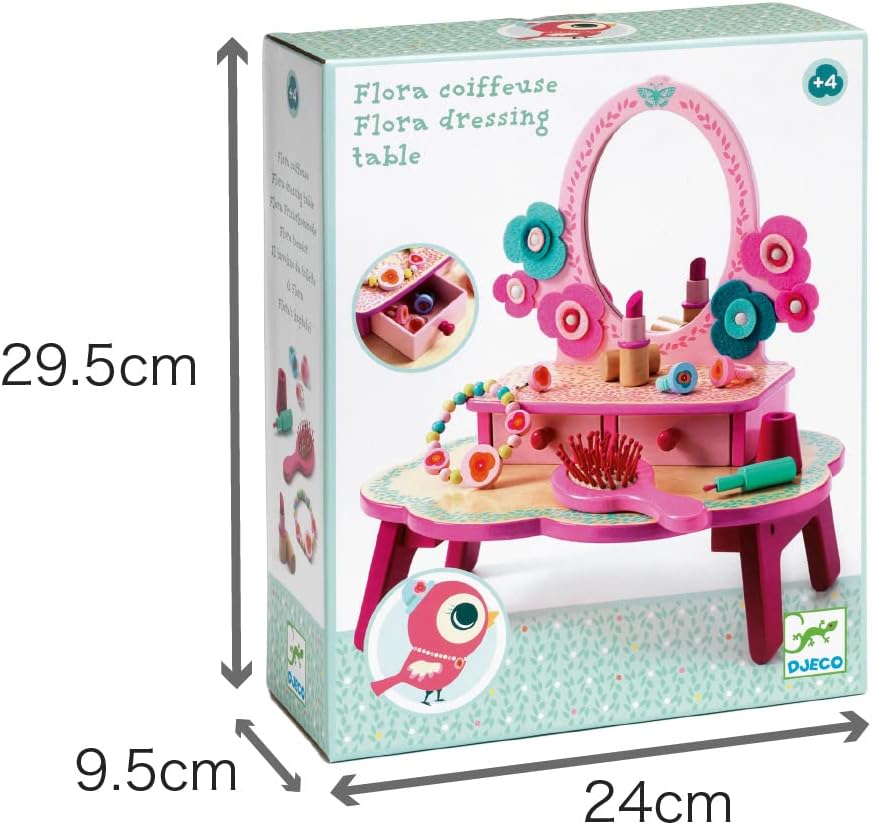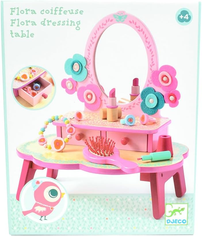 • CHARMING VANITY SET FOR BUDDING FASHIONISTAS: This delightful wooden dressing table by DJECO features a large oval mirror, two drawers for storing treasures, and a whimsical floral design, perfect for hours of imaginative pretend play.