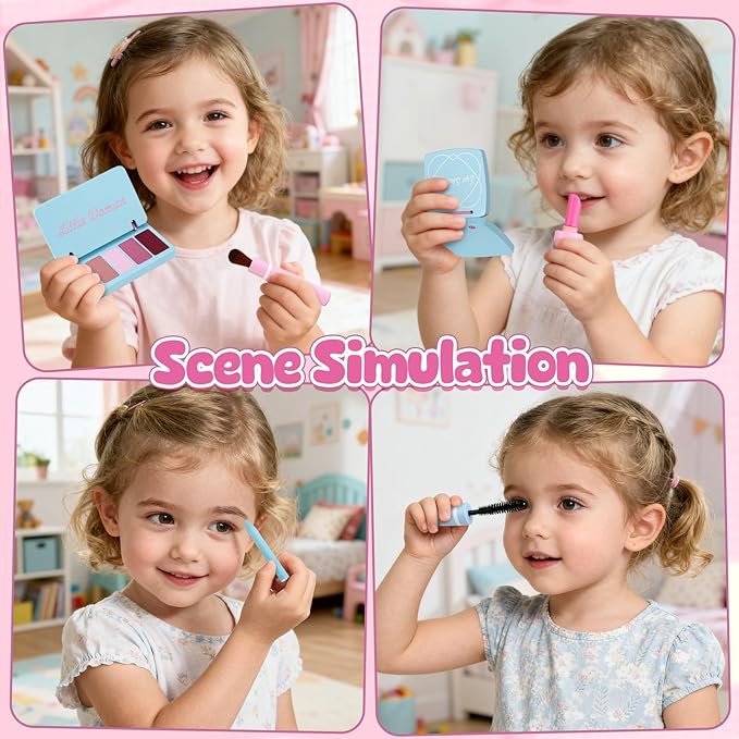 - Rich Accessories: There’s pretend lipstick, sparkly eyeshadow, a tiny perfume bottle, a comb, a hair dryer, and even a unicorn headband—just like the real thing! Kids can copy mom doing makeup, style their dolls’ hair, or play “salon” for hours. It’s like a big box of fun that helps them get creative and practice using their little hands